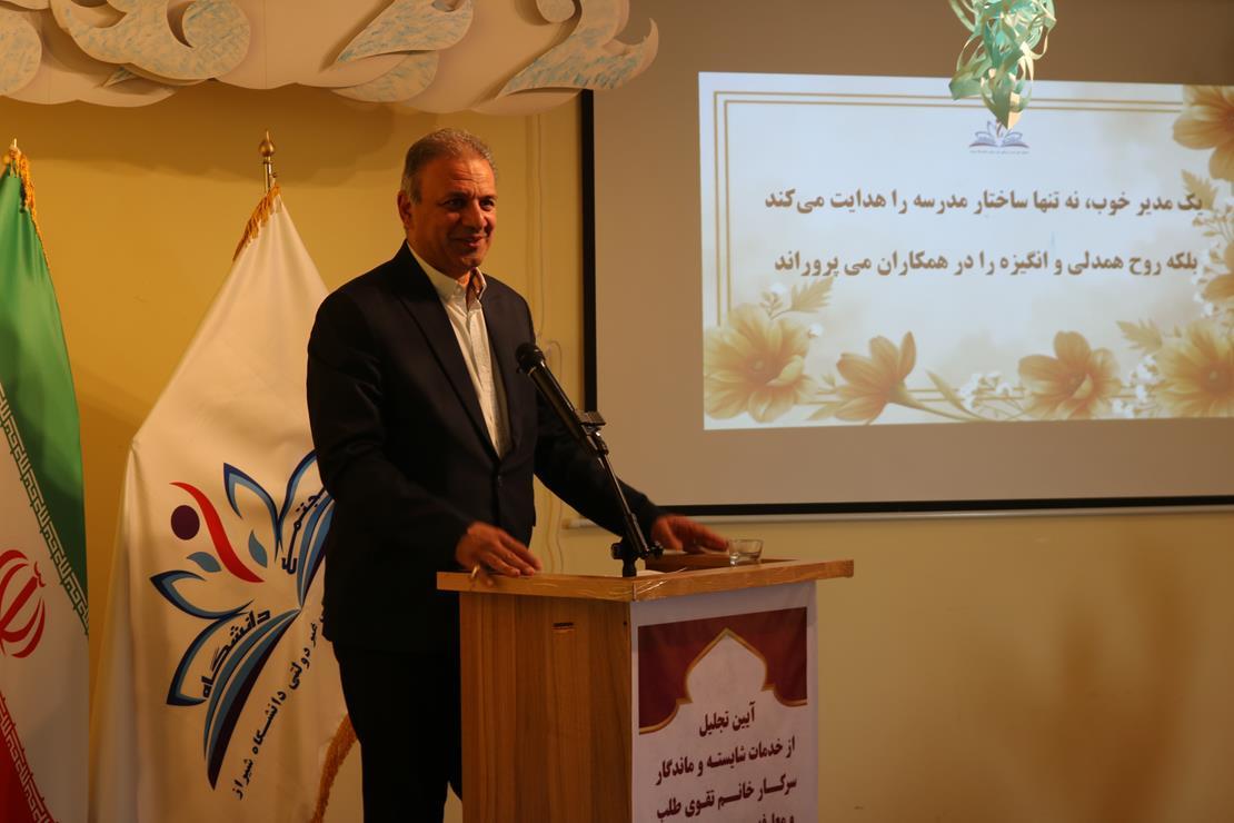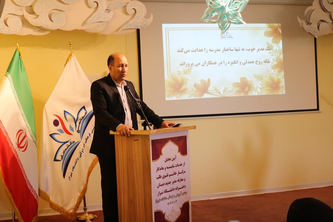 جلسه تودیع و معارفه مدیر دبستان دخترانه دانشگاه شیراز با حضور جمعی از مسئولان آموزش و پرورش، مدیران و اعضای هیئتمدیره مجتمع آموزشی و فرهنگی دانشگاه شیراز برگزار شد.