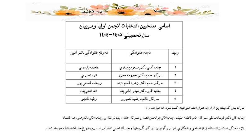 اسامی منتخبین انجمن اولیاء و مربیان1405-1404