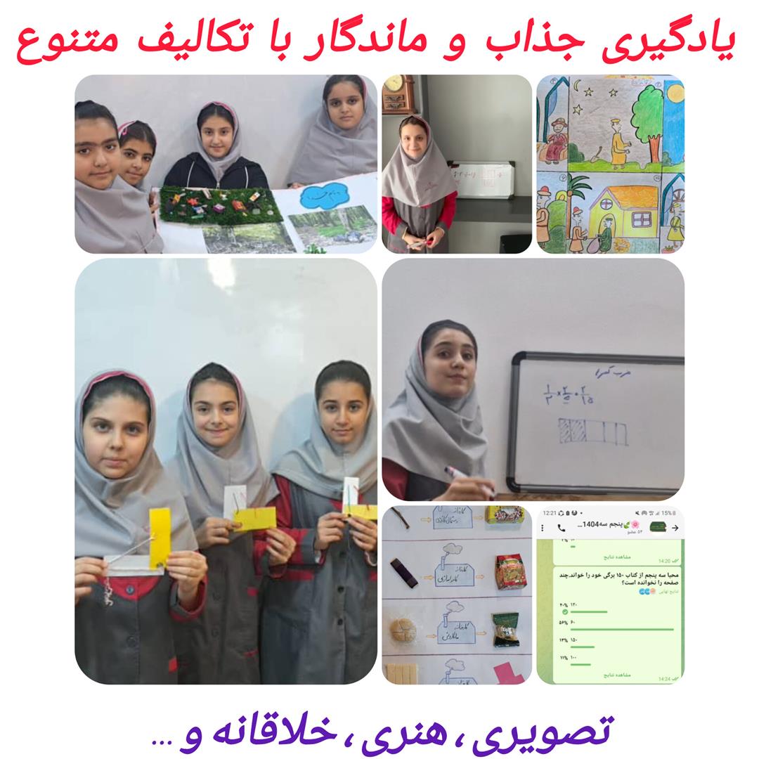 تکالیف دانش‌آموزان به‌صورت متنوع، خلاقانه و هیجان‌انگیز طراحی می‌شود تا یادگیری عمیق‌تری شکل بگیرد. از جمله این فعالیت‌ها می‌توان به نقاشی از آموخته ها، ساخت کاردستی، تدریس بخشی از مطالب آموخته‌شده در منزل و ارسال کلیپ آموزشی توسط دانش‌آموزان، و همچنین توضیح روان و شفاف مفاهیم درسی در جمع خانواده و ... اشاره کرد. این شیوه‌ها به تقویت بیان، اعتمادبه‌نفس و تثبیت یادگیری کمک می‌کند.